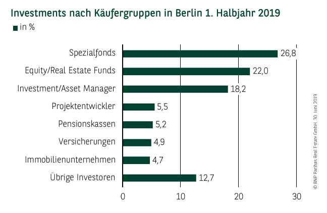 Das Käuferspektrum zeigt sich traditionell breit aufgestellt. Die ersten beiden Plätze belegen dicht beieinander Investment Manager (18,5 %) und Spezialfonds (18 %), die damit vor Equity/Real Estate Funds (14 %), Immobilienunternehmen (12 %) und Pensionskassen (10 %) in Führung gehen. Anteile jenseits der 5-%-Marke erzielen darüber hinaus Immobilien AGs/REITs (7 %) und Privatanleger (5 %). Mit rund 16 % ist zudem der Anteil aller hier noch nicht genannten Käufertypen hoch. Überdurchschnittlich ist auch der Ausländeranteil, zumindest im bundesweiten Vergleich und mit Blick auf die anderen A-Standorte. Knapp 48 % des Kapitals flossen aus dem Ausland in den Berliner Markt. Der Schnitt der A-Standorte liegt etwa 10 Prozentpunkte niedriger, bundesweit sind es sogar 12 Prozentpunkte. Mit rund 20 % sind Anleger aus dem nordamerikanischen Raum nach den deutschen Investoren am stärksten beteiligt, aber auch europäische (18 %) sowie Käufer aus Nahost (10 %) waren sehr aktiv.