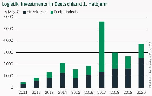 Der Markt für Logistik-Investments zeigte sich im ersten Halbjahr noch verhältnismäßig unbeeindruckt von der Corona-Krise. Mit einem Transaktionsvolumen von 3,74 Mrd. € wurde der langjährige Durchschnitt um beeindruckende 61 % getoppt, sodass unterm Strich das zweitbeste Halbjahresergebnis aller Zeiten steht. Zwar trägt insbesondere der Rekordjahresauftakt aus Q1 maßgeblich zum überdurchschnittlichen Abschneiden bei, jedoch ist auch das zweite Quartal für sich genommen mit 1,42 Mrd. € alles andere als ein Indiz für einen auf Sparflamme laufenden Markt. So ist das aktuelle Quartalsergebnis deutlich niedriger als der Schnitt der vergangenen zehn Quartale, steht aber gleichzeitig in der Tradition des regelmäßig zur Jahresmitte etwas abflachenden Marktgeschehens. Zieht man nur die Q2-Ergebnisse als Vergleichsbasis heran, schlägt ebenfalls das zweitbeste Ergebnis aller Zeiten zu Buche. Als besonders außergewöhnlich präsentiert sich derweil der mit knapp 68 % sehr hohe Anteil der Einzeltransaktionen. Unter anderem gleich sieben Abschlüsse jenseits der 100 Mio.-€-Marke katapultieren das Umsatzvolumen auf satte 2,53 Mrd. € und sorgen so für einen neuen Rekord.