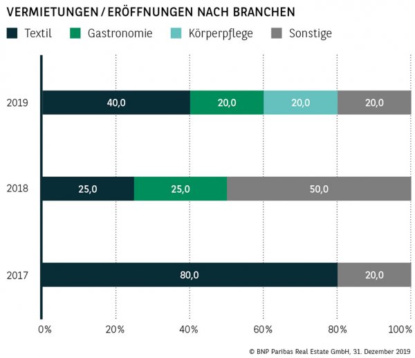 Bei den wenigen Vermietungen sticht Only hervor. Das dänische Mode-Label hat sich in der Schönbornstraße gut 400 m² gesichert, um dort einen Monolabel-Store zu betreiben. Außerdem bereichert das niederländische Brillen-Konzept eyes + more den Branchenmix im Kürschnerhof, und in der Juliuspromenade hat im November das Modegeschäft Skand Shop seine Pforten geöffnet. Aber auch ein Kundenmagnet aus der Gastro-Branche konnte sich 2019 eine Fläche in der Würzburger City sichern: So wird die Franchise-Kette L’Osteria 2021 eine Filiale in unmittelbarer Nähe zum Würzburger Dom eröffnen.